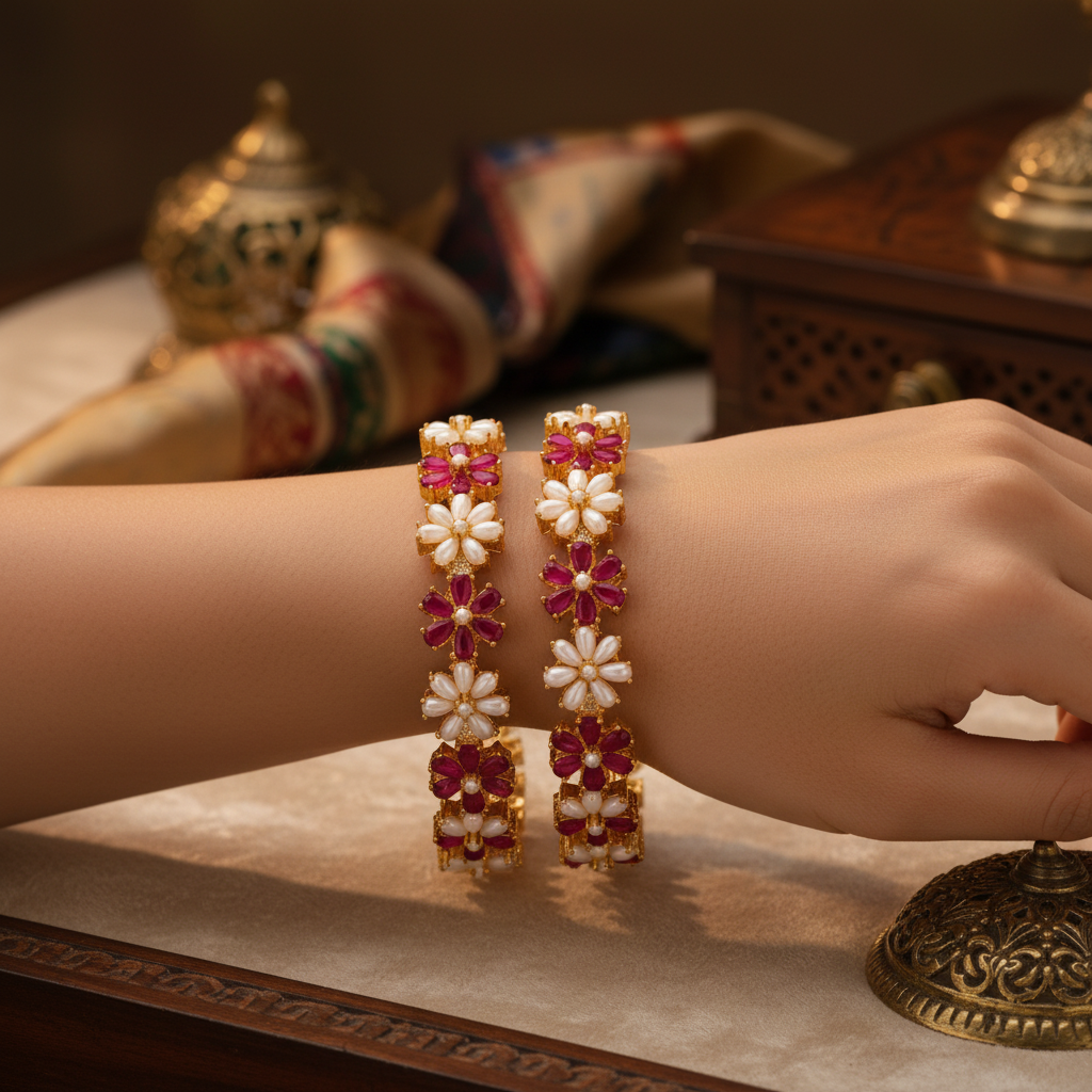 433873-Pretty Precious Gold Plated Cubic Zirconia/American Diamond Traditional Bangles/Bracelet Set of 2 for Women and Girls- Ruby Green (Size 2.8)
